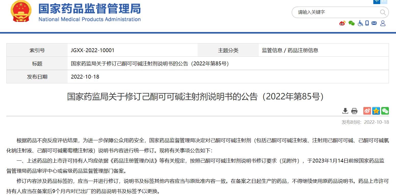 國家藥監局關于修訂己酮可可堿注射劑說明書的公告(2022年第85號)