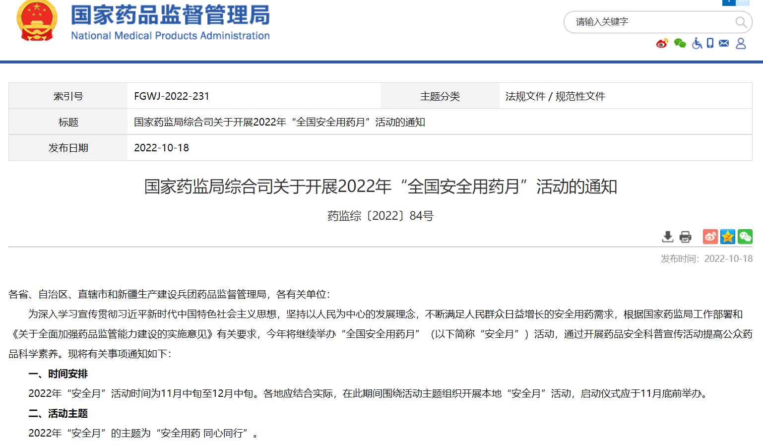 國家藥監局綜合司關于開展2022年“全國安全用藥月”活動的通知