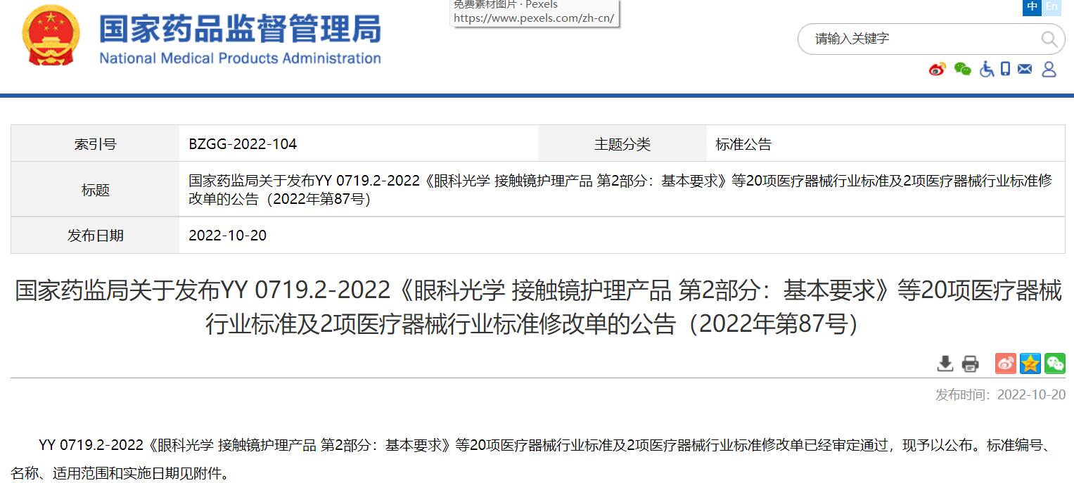 國家藥監局關于發布YY 0719.2-2022《眼科光學接觸鏡護理產品第2部分:基本要求》等20項醫療器械行業標準及2項醫療器械行業標準修改單的公告(2022年第87號)
