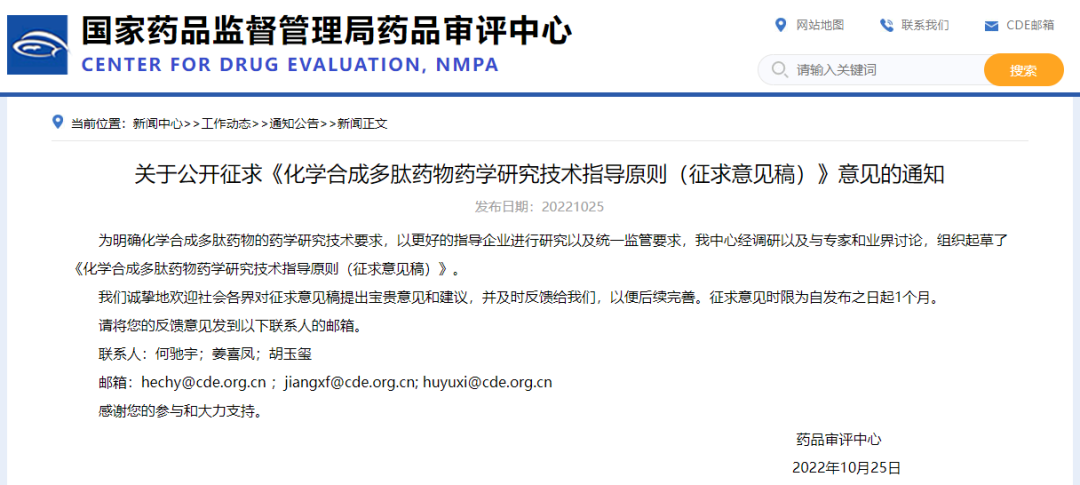 關(guān)于公開(kāi)征求《化學(xué)合成多肽藥物藥學(xué)研究技術(shù)指導(dǎo)原則(征求意見(jiàn)稿)》意見(jiàn)的通知
