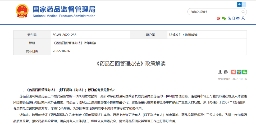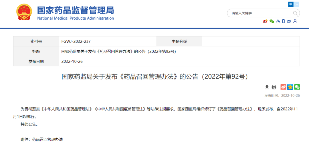 國(guó)家藥監(jiān)局關(guān)于發(fā)布《藥品召回管理辦法》的公告(2022年第92號(hào))