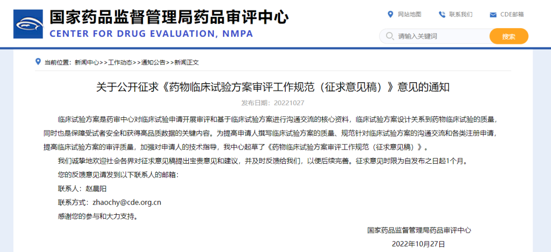 關(guān)于公開(kāi)征求《藥物臨床試驗(yàn)方案審評(píng)工作規(guī)范(征求意見(jiàn)稿)》意見(jiàn)的通知