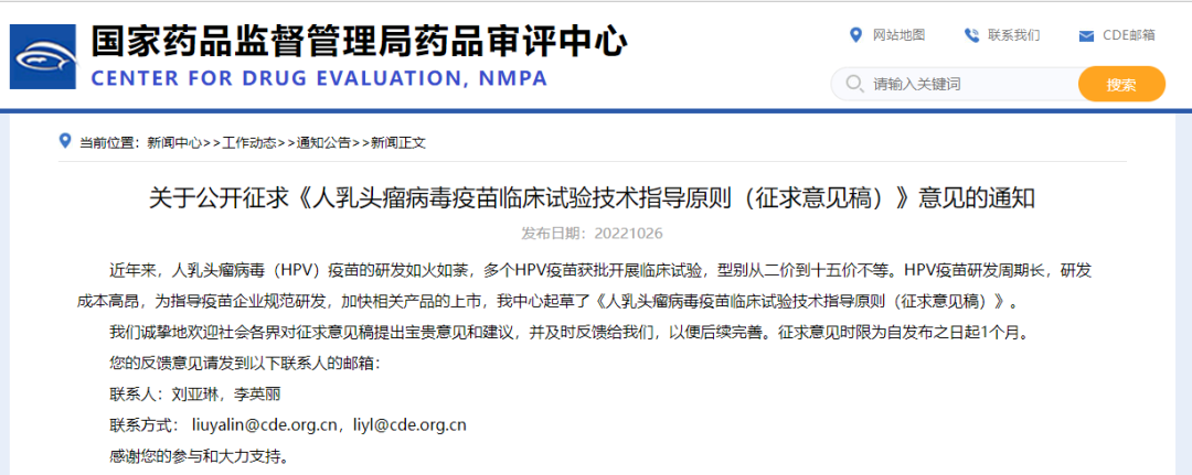 關(guān)于公開(kāi)征求《人乳頭瘤病毒疫苗臨床試驗(yàn)技術(shù)指導(dǎo)原則(征求意見(jiàn)稿)》意見(jiàn)的通知