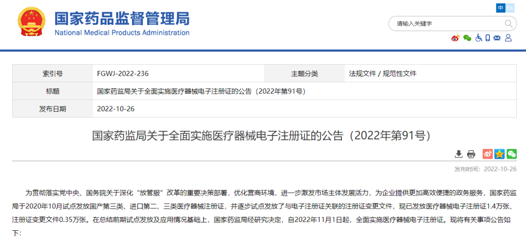 國(guó)家藥監(jiān)局關(guān)于全面實(shí)施醫(yī)療器械電子注冊(cè)證的公告(2022年第91號(hào))