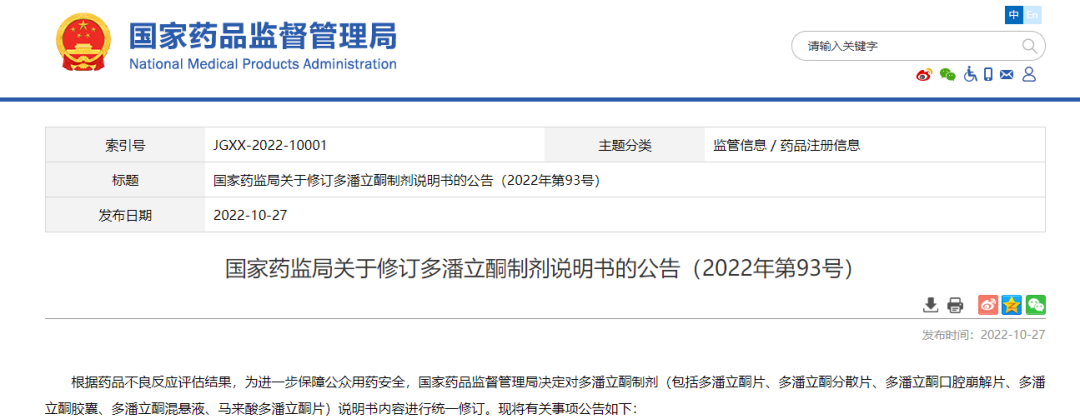 國(guó)家藥監(jiān)局關(guān)于修訂多潘立酮制劑說(shuō)明書(shū)的公告(2022年第93號(hào))