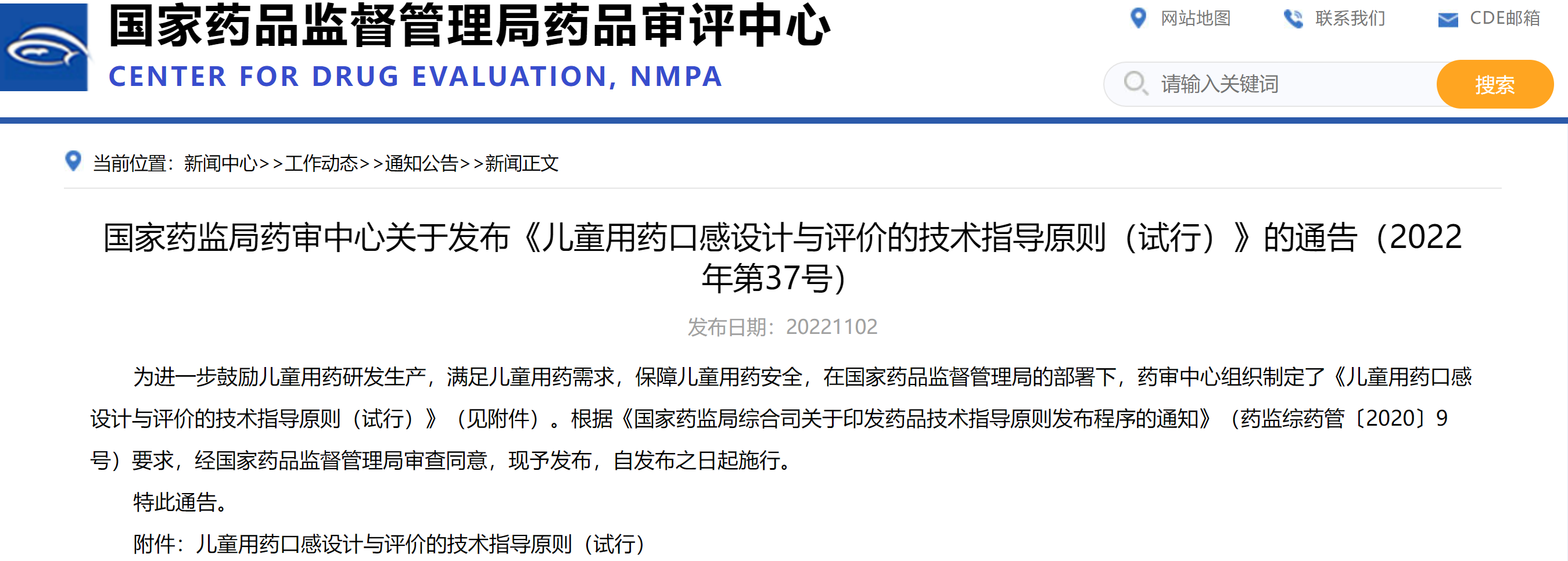 國家藥監(jiān)局藥審中心關于發(fā)布《兒童用藥口感設計與評價的技術指導原則(試行)》的通告(2022年第37號)