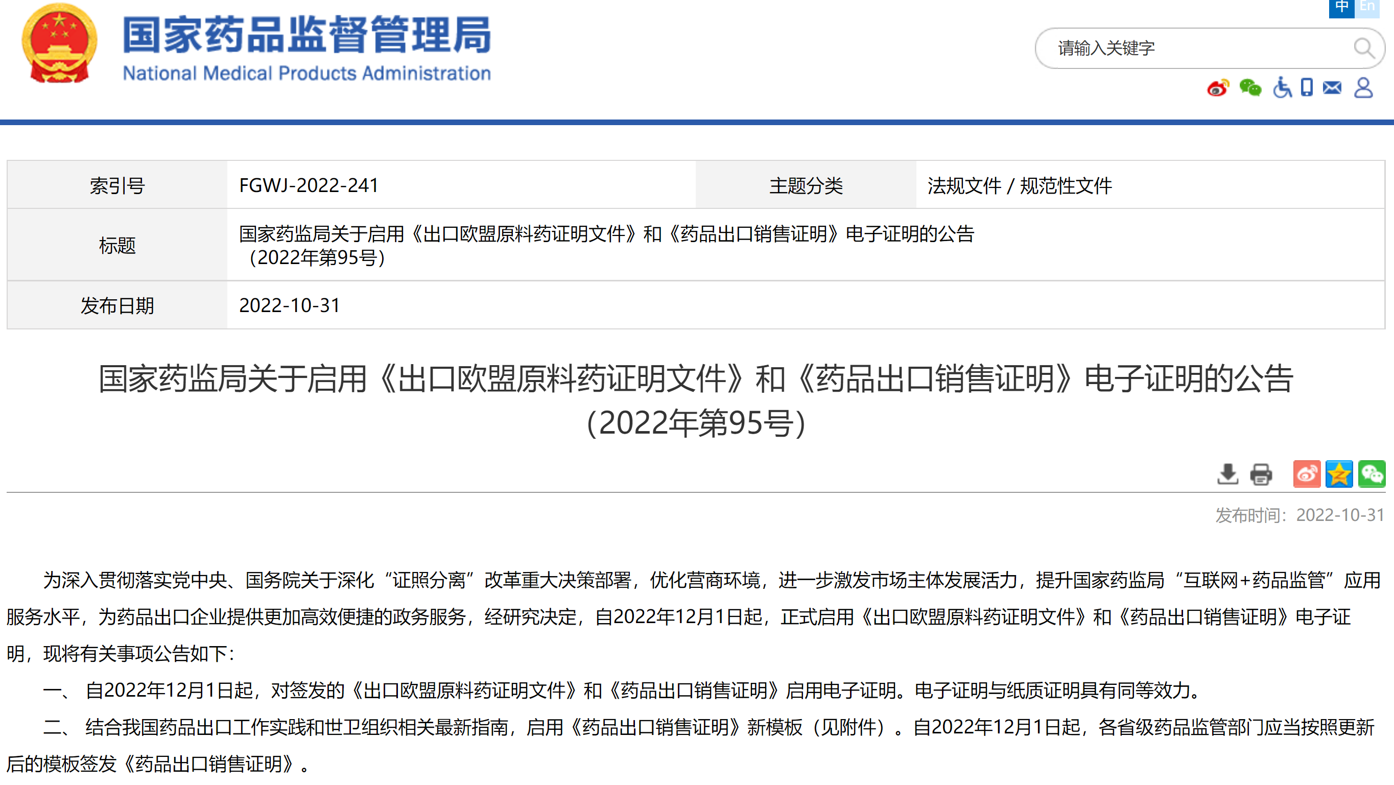 國家藥監(jiān)局關于啟用《出口歐盟原料藥證明文件》和《藥品出口銷售證明》電子證明的公告(2022年第95號)