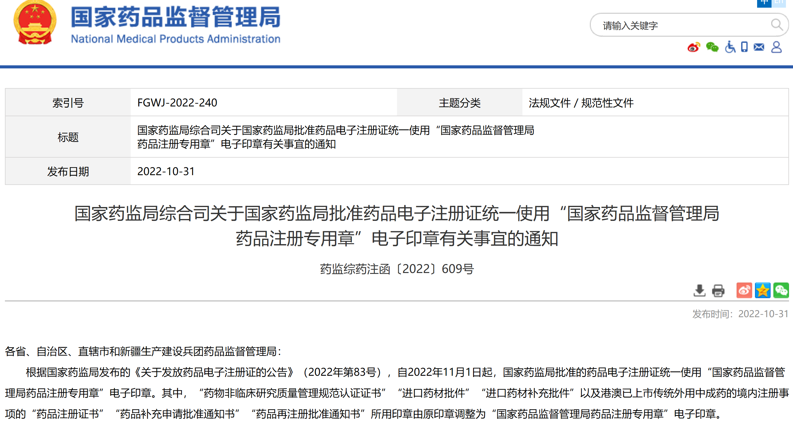 國家藥監(jiān)局綜合司關于國家藥監(jiān)局批準藥品電子注冊證統(tǒng)一使用“國家藥品監(jiān)督管理局藥品注冊專用章”電子印章有關事宜的通知