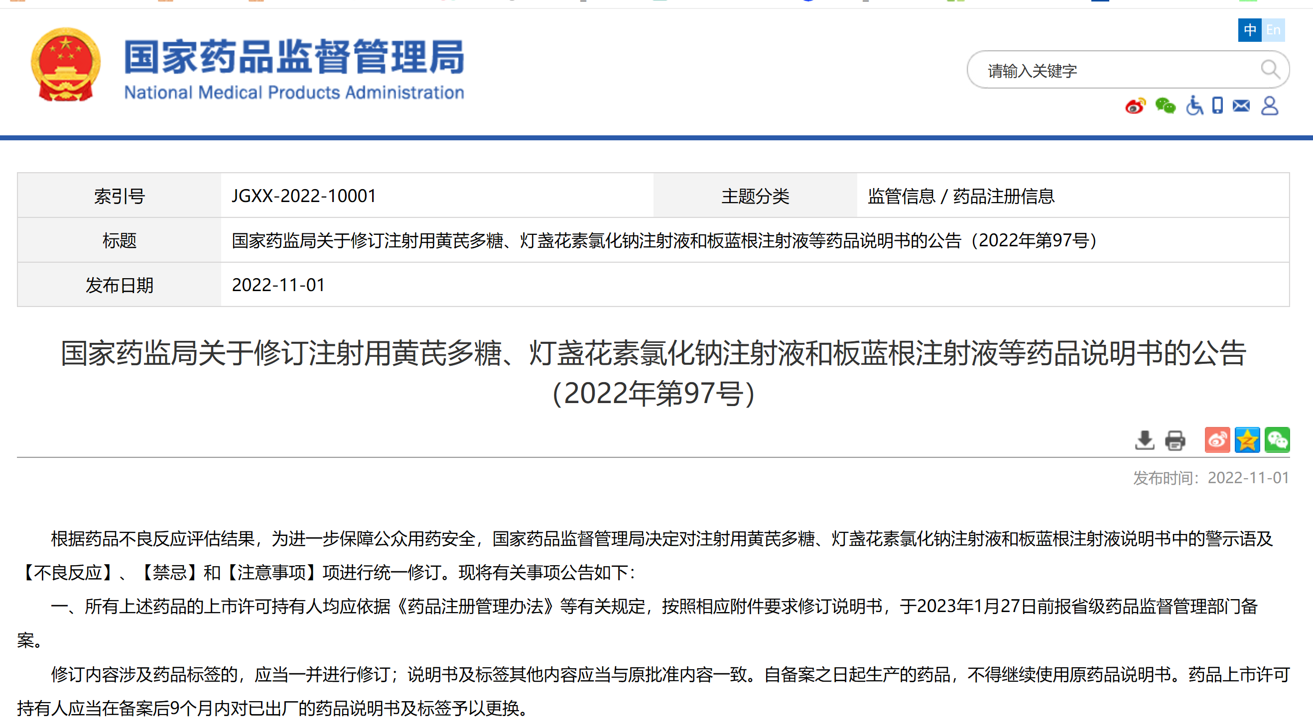 國家藥監(jiān)局關于修訂注射用黃芪多糖、燈盞花素氯化鈉注射液和板藍根注射液等藥品說明書的公告(2022年第97號)
