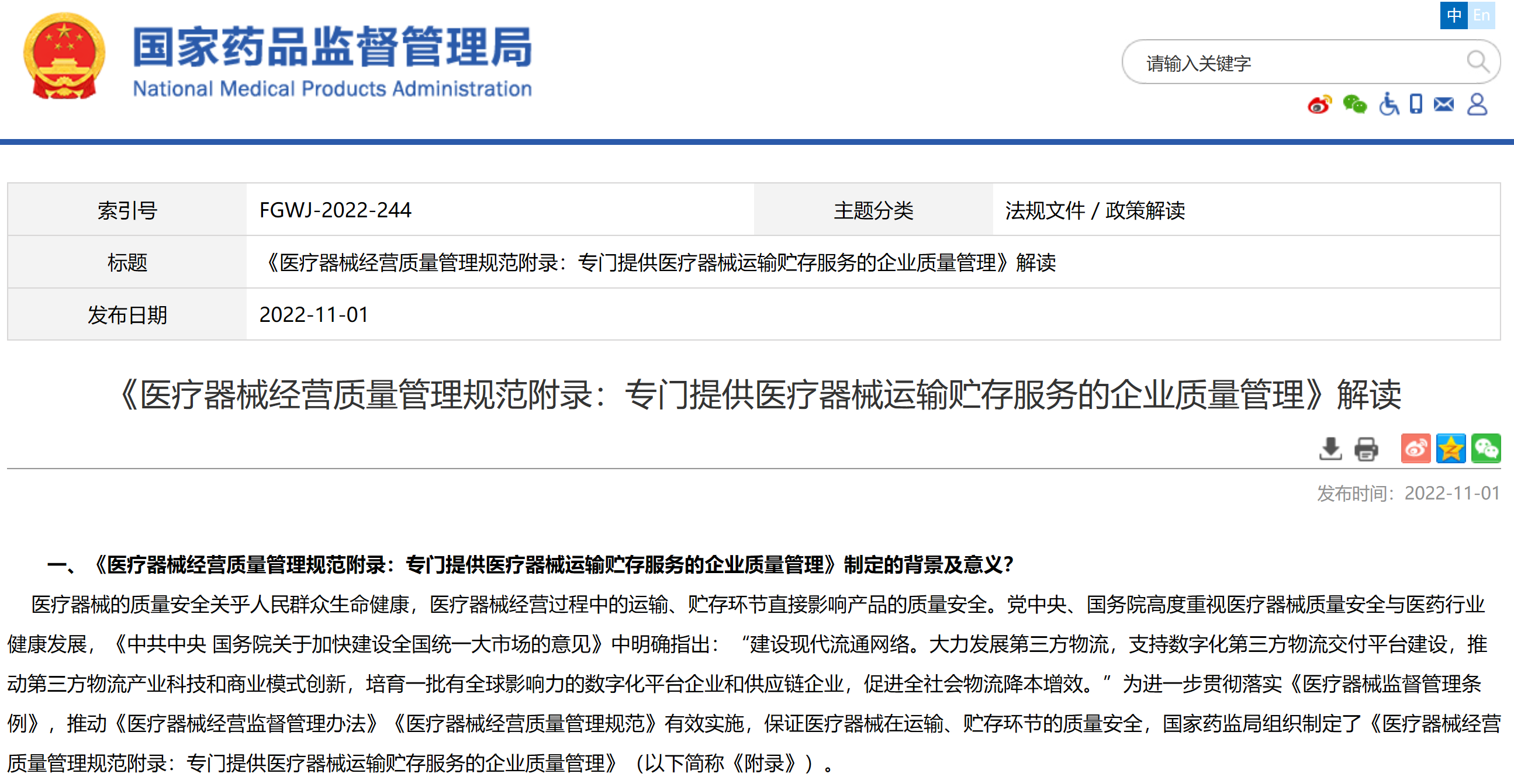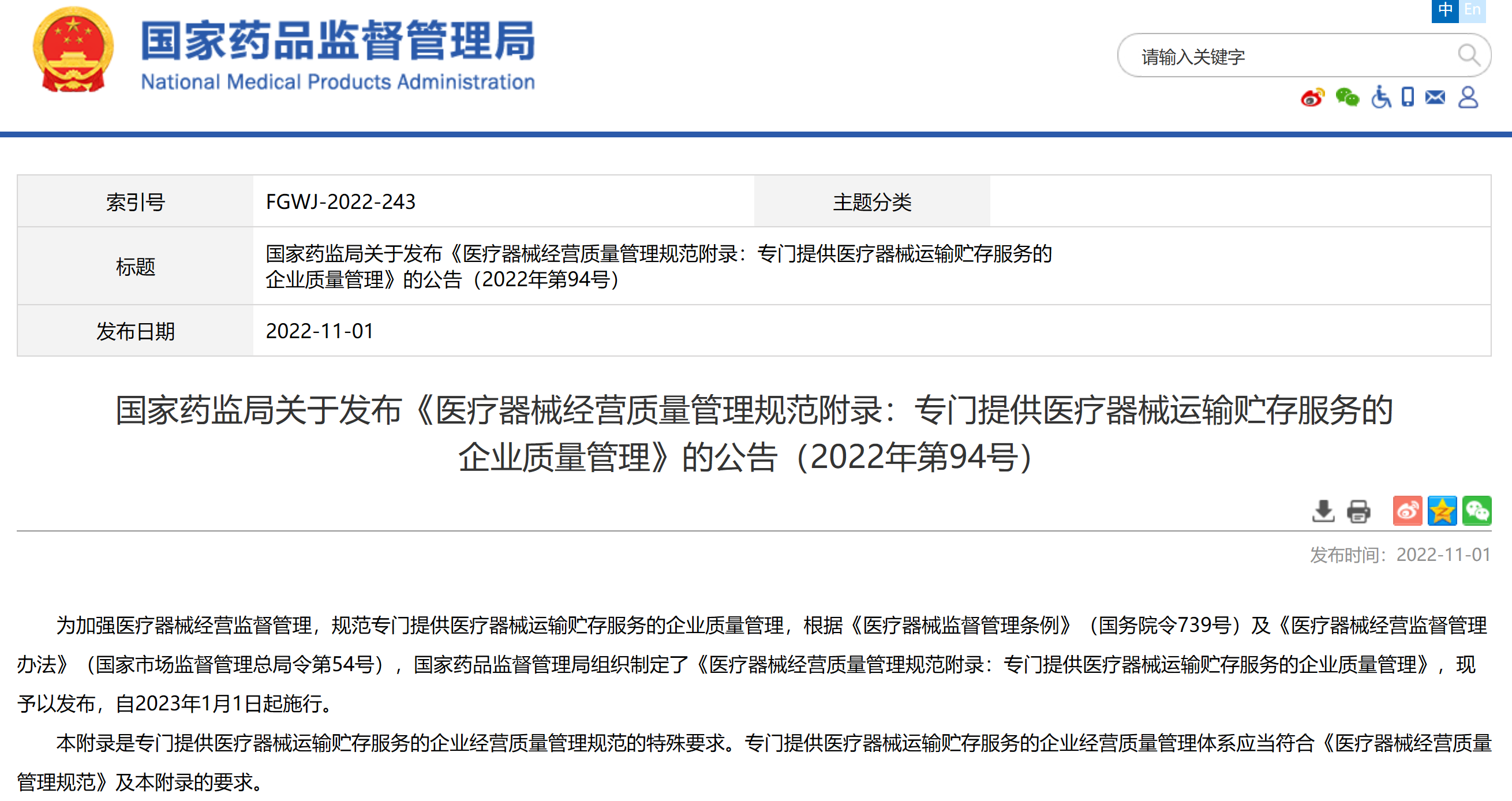 國家藥監(jiān)局關于發(fā)布《醫(yī)療器械經(jīng)營質量管理規(guī)范附錄:專門提供醫(yī)療器械運輸貯存服務的企業(yè)質量管理》的公告(2022年第94號)