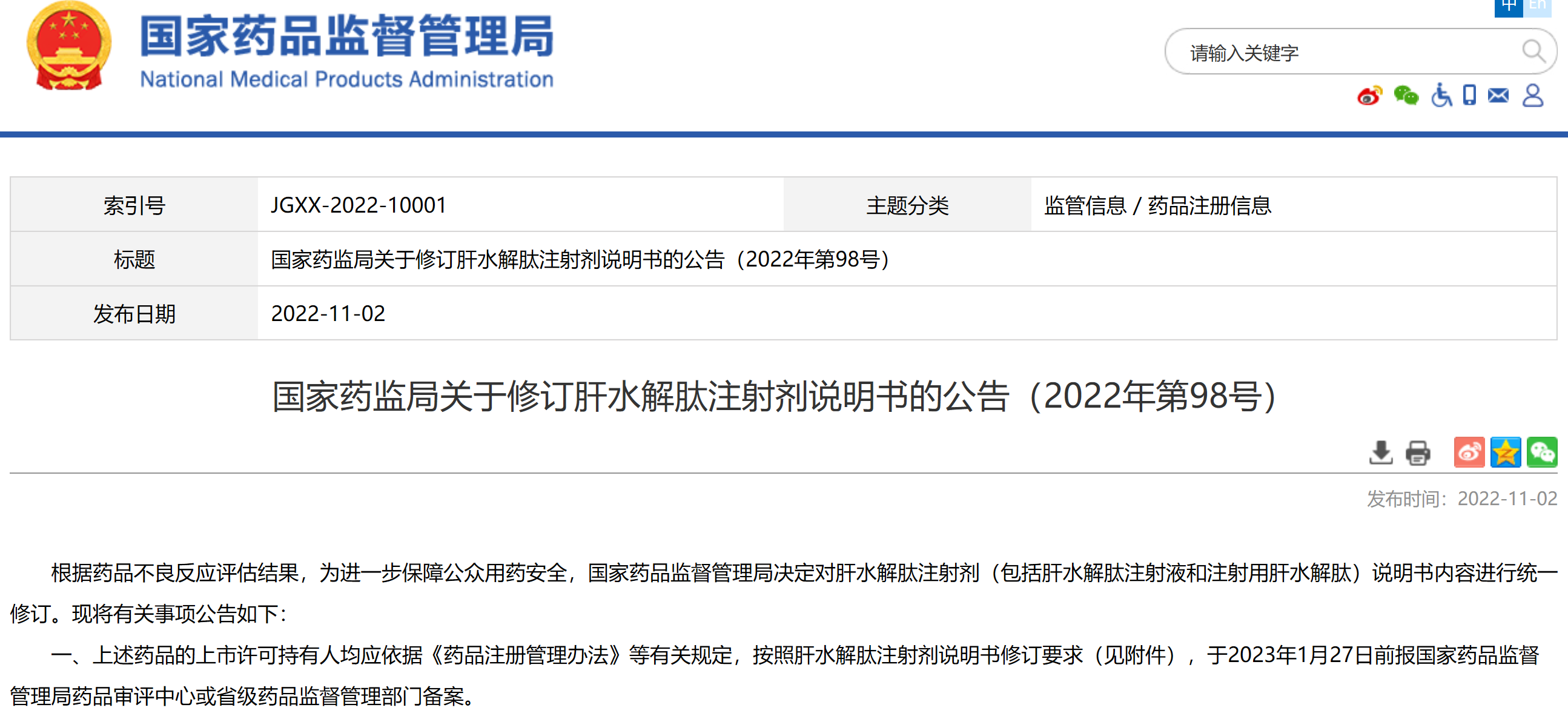 國家藥監(jiān)局關于修訂肝水解肽注射劑說明書的公告(2022年第98號)