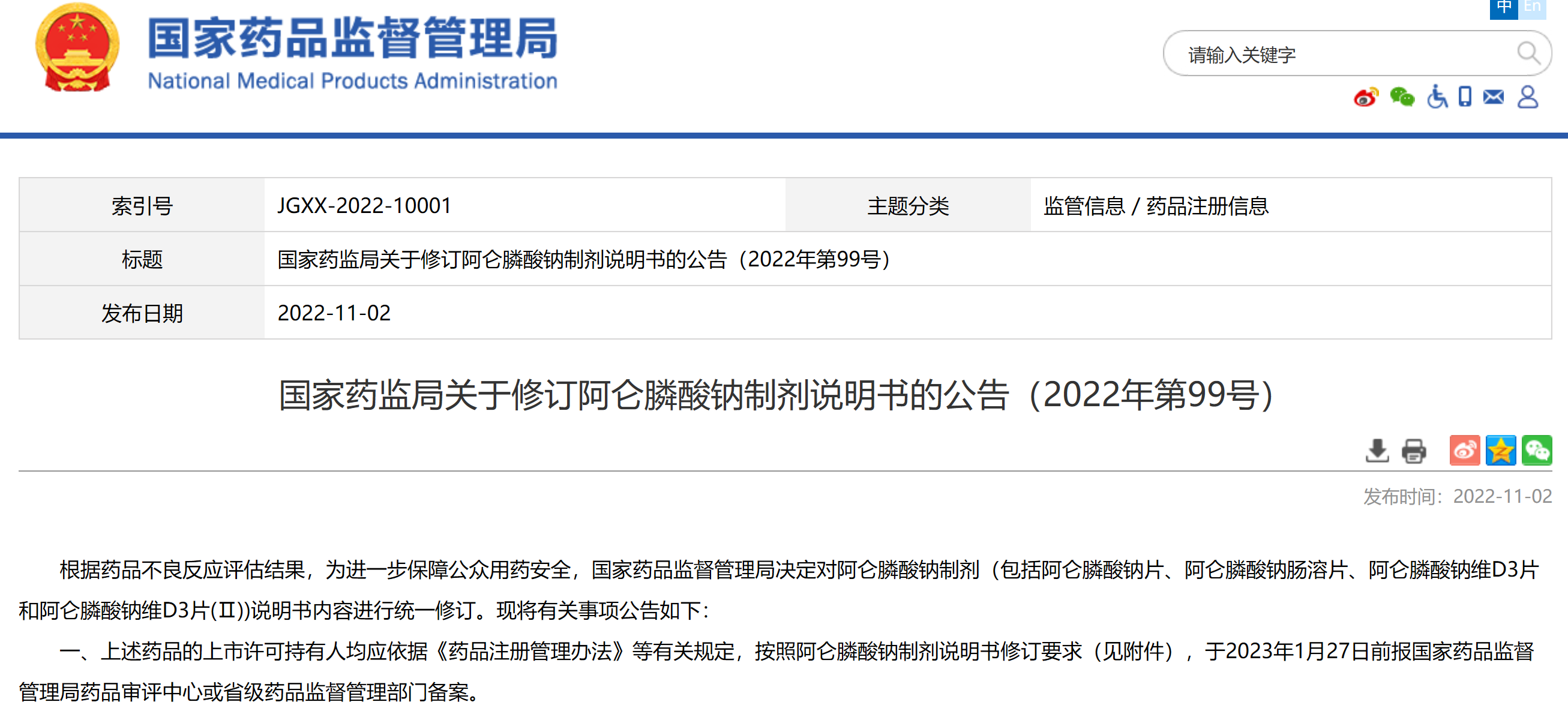 國家藥監(jiān)局關于修訂阿侖膦酸鈉制劑說明書的公告(2022年第99號)