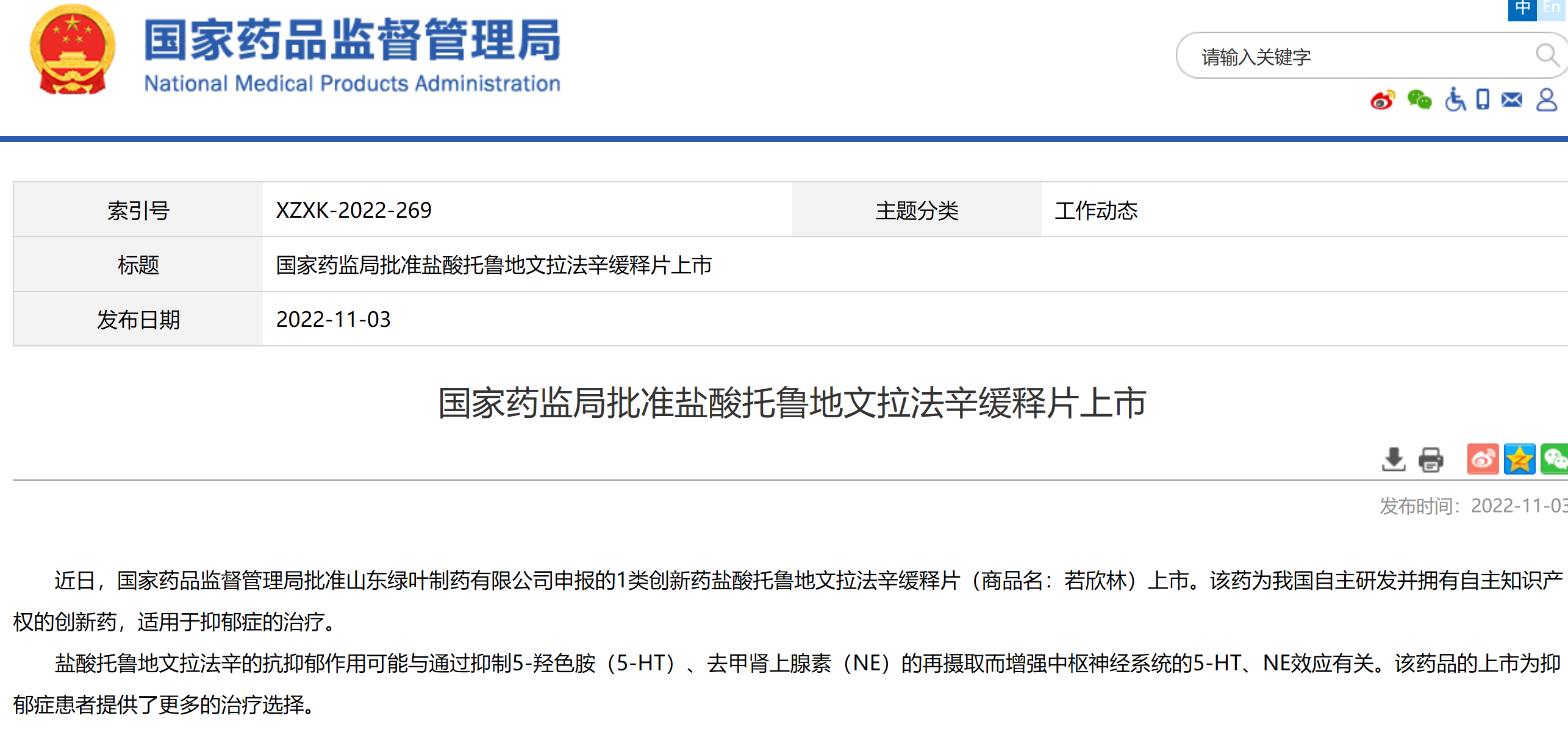 國家藥監(jiān)局批準鹽酸托魯?shù)匚睦ㄐ辆忈屍鲜?/span>