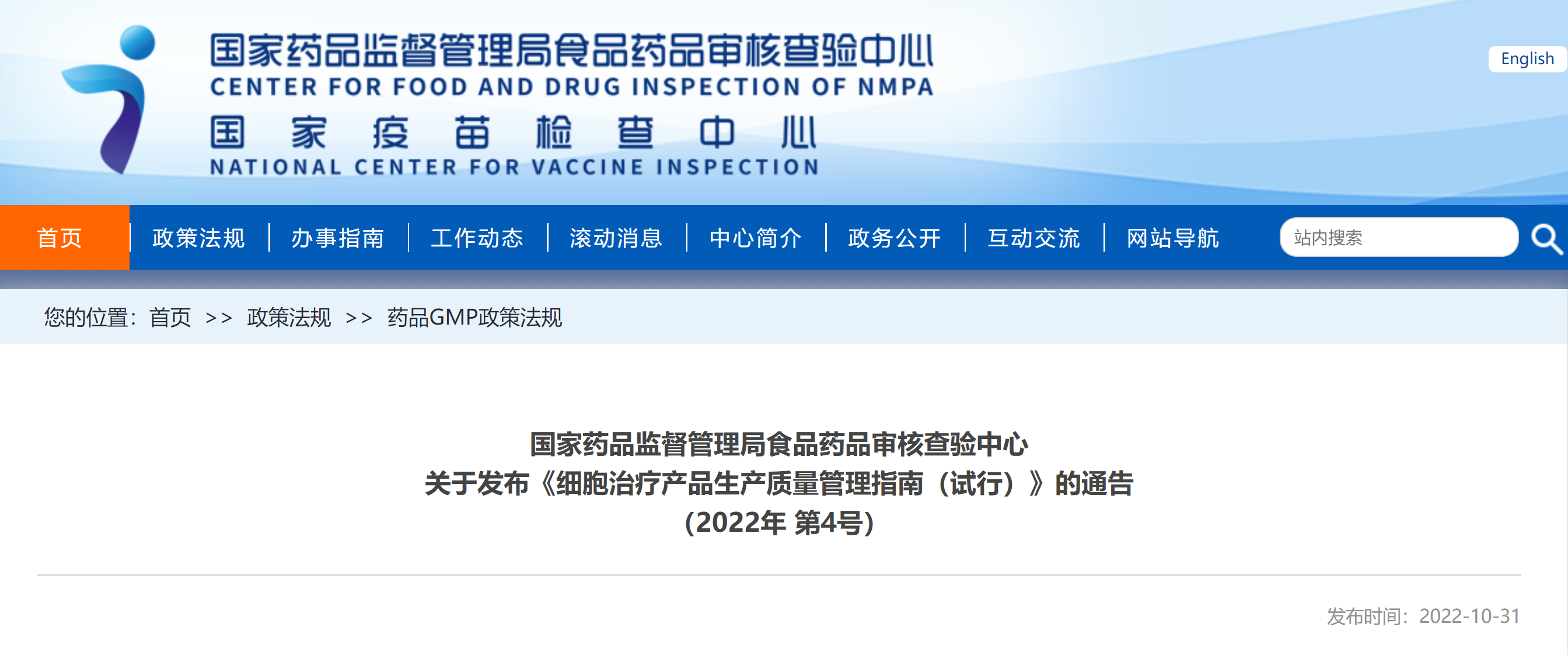 國家藥品監(jiān)督管理局食品藥品審核查驗中心關于發(fā)布《細胞治療產(chǎn)品生產(chǎn)質量管理指南(試行)》的通告(2022年第4號)