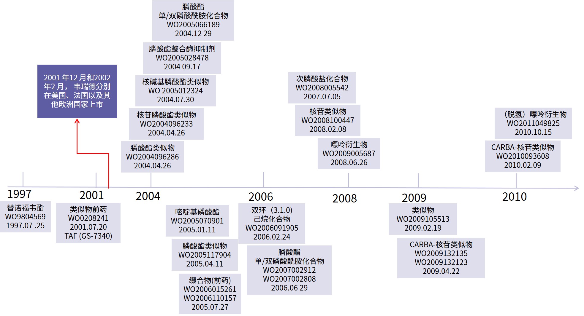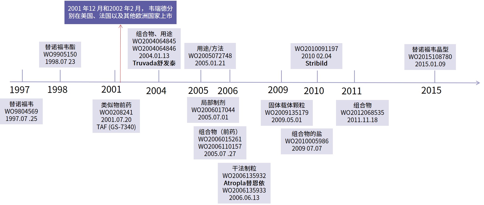 首先,以時間為導向,縱向分析原研公司對替諾福韋酯的專利的布局,見下圖。