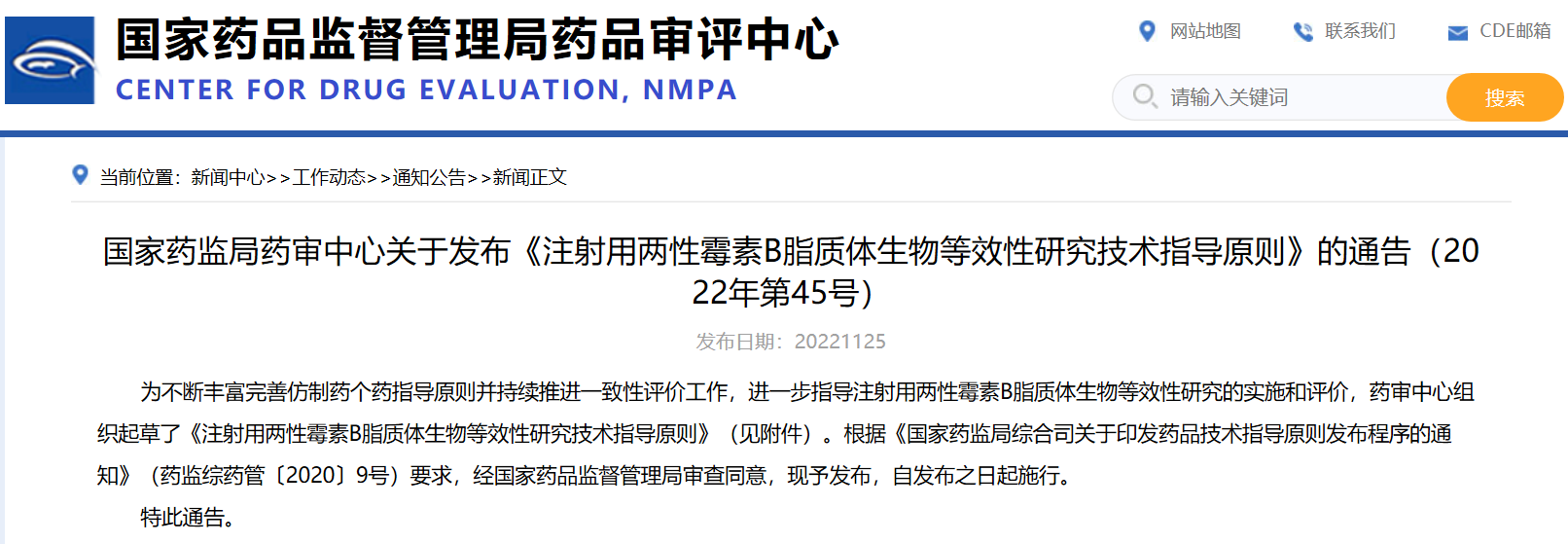 國家藥監(jiān)局藥審中心關(guān)于發(fā)布《注射用兩性霉素B脂質(zhì)體生物等效性研究技術(shù)指導(dǎo)原則》的通告(2022年第45號(hào))