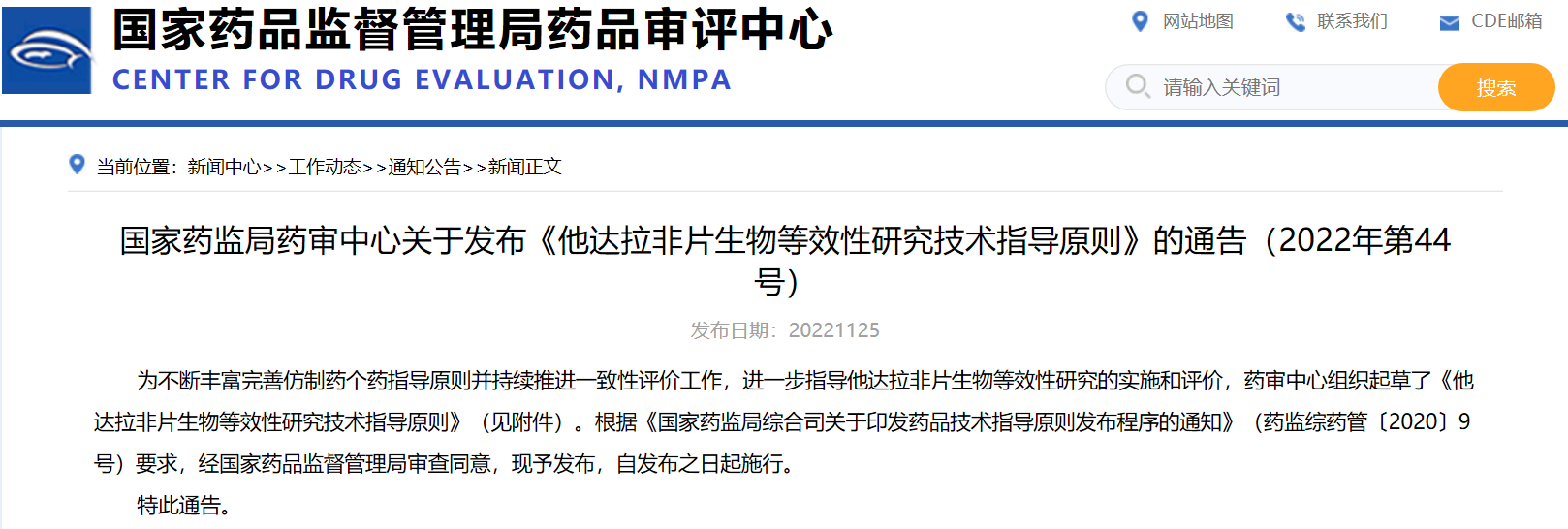 國家藥監(jiān)局藥審中心關(guān)于發(fā)布《他達(dá)拉非片生物等效性研究技術(shù)指導(dǎo)原則》的通告(2022年第44號(hào))