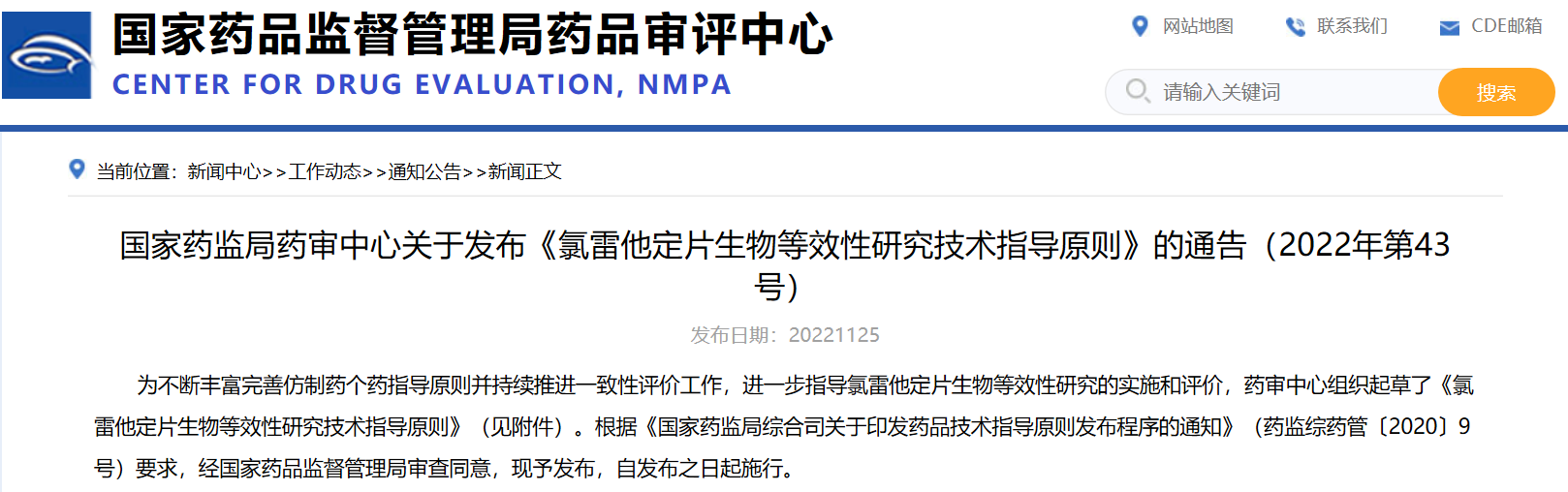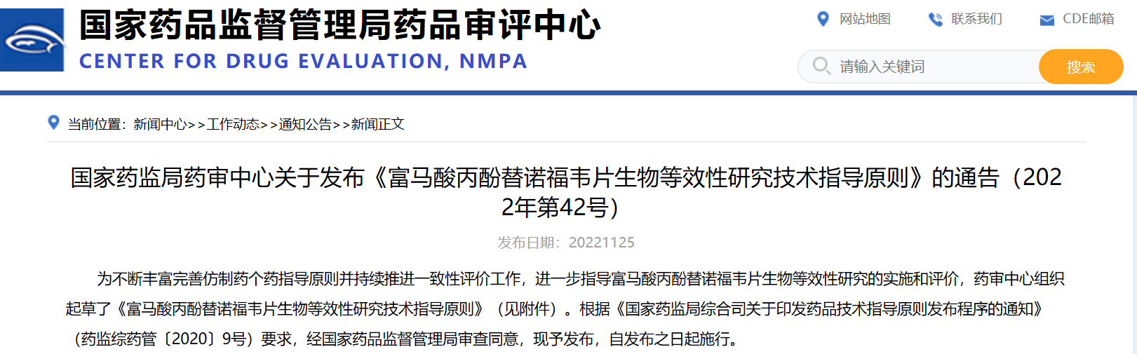 國家藥監(jiān)局藥審中心關(guān)于發(fā)布《富馬酸丙酚替諾福韋片生物等效性研究技術(shù)指導(dǎo)原則》的通告(2022年第42號(hào))