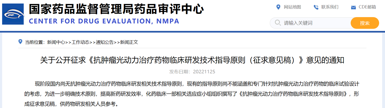 關(guān)于公開征求《抗腫瘤光動(dòng)力治療藥物臨床研發(fā)技術(shù)指導(dǎo)原則(征求意見稿)》意見的通知