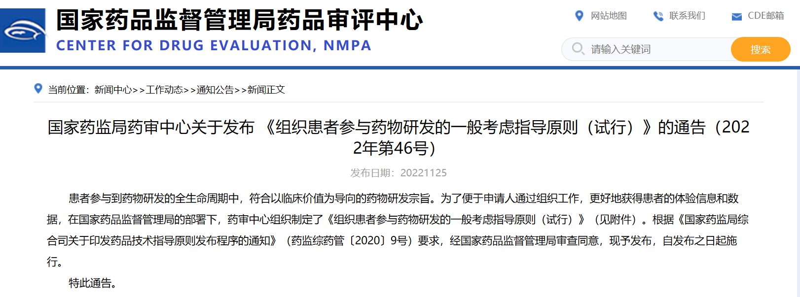 國家藥監(jiān)局藥審中心關(guān)于發(fā)布 《組織患者參與藥物研發(fā)的一般考慮指導(dǎo)原則(試行)》的通告(2022年第46號(hào))