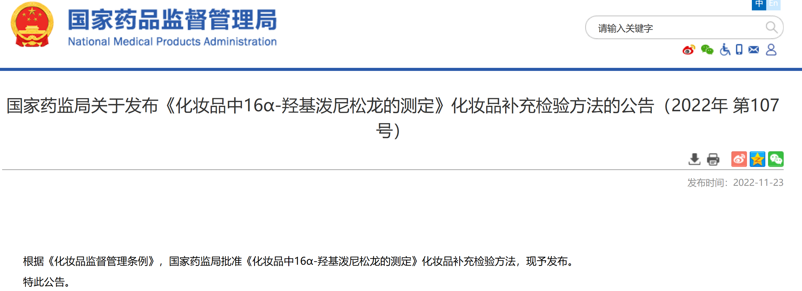 國家藥監(jiān)局關(guān)于發(fā)布《化妝品中16α-羥基潑尼松龍的測(cè)定》化妝品補(bǔ)充檢驗(yàn)方法的公告