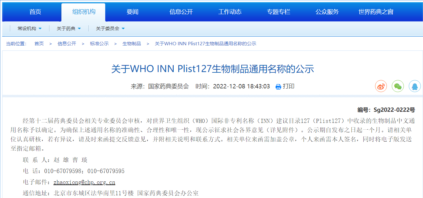 關于WHO INN Plist127生物制品通用名稱的公示