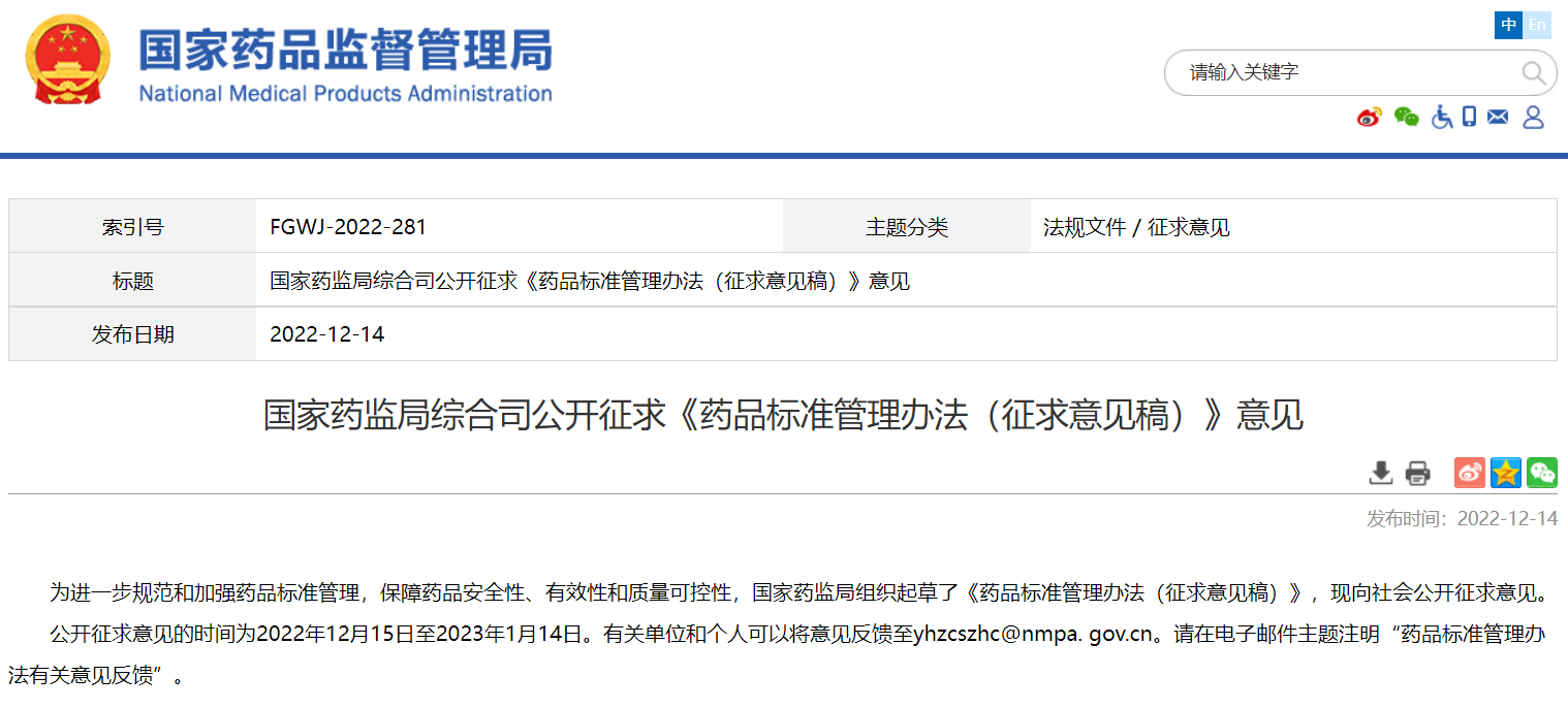 國家藥監局綜合司公開征求《藥品標準管理辦法(征求意見稿)》意見