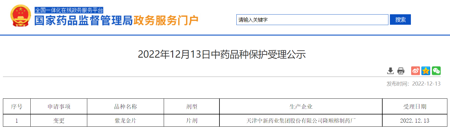 2022年12月13日中藥品種保護受理公示