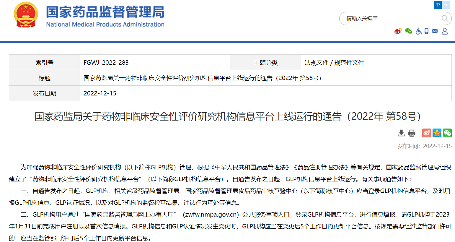 國家藥監局關于藥物非臨床安全性評價研究機構信息平臺上線運行的通告(2022年 第58號)