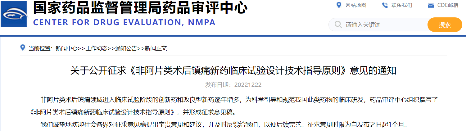 關于公開征求《非阿片類術后鎮痛新藥臨床試驗設計技術指導原則》意見的通知