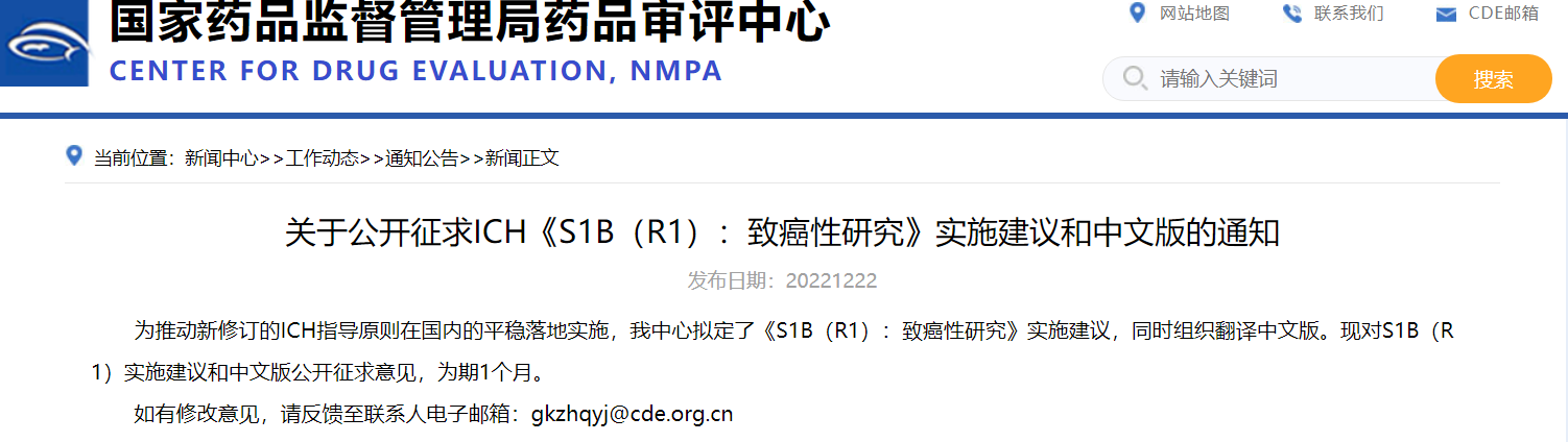 關于公開征求ICH《S1B(R1):致癌性研究》實施建議和中文版的通知