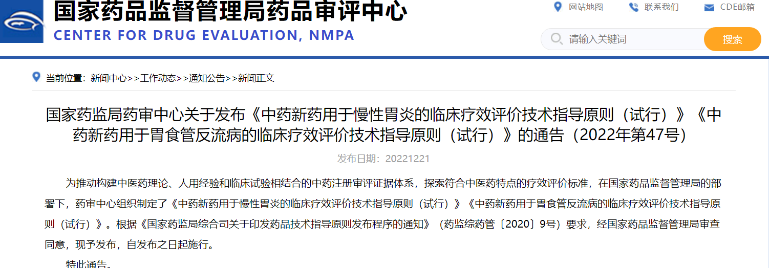 關于發布《中藥新藥用于慢性胃炎的臨床療效評價技術指導原則(試行)》《中藥新藥用于胃食管反流病的臨床療效評價技術指導原則(試行)》的通告
