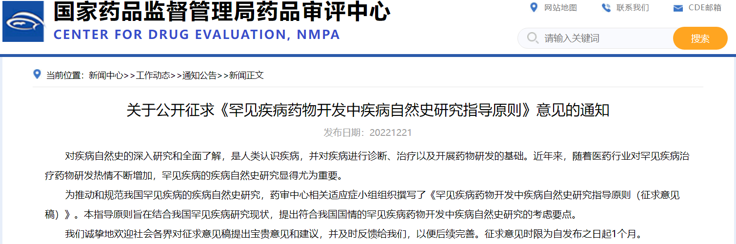 關于公開征求《罕見疾病藥物開發中疾病自然史研究指導原則》意見的通知