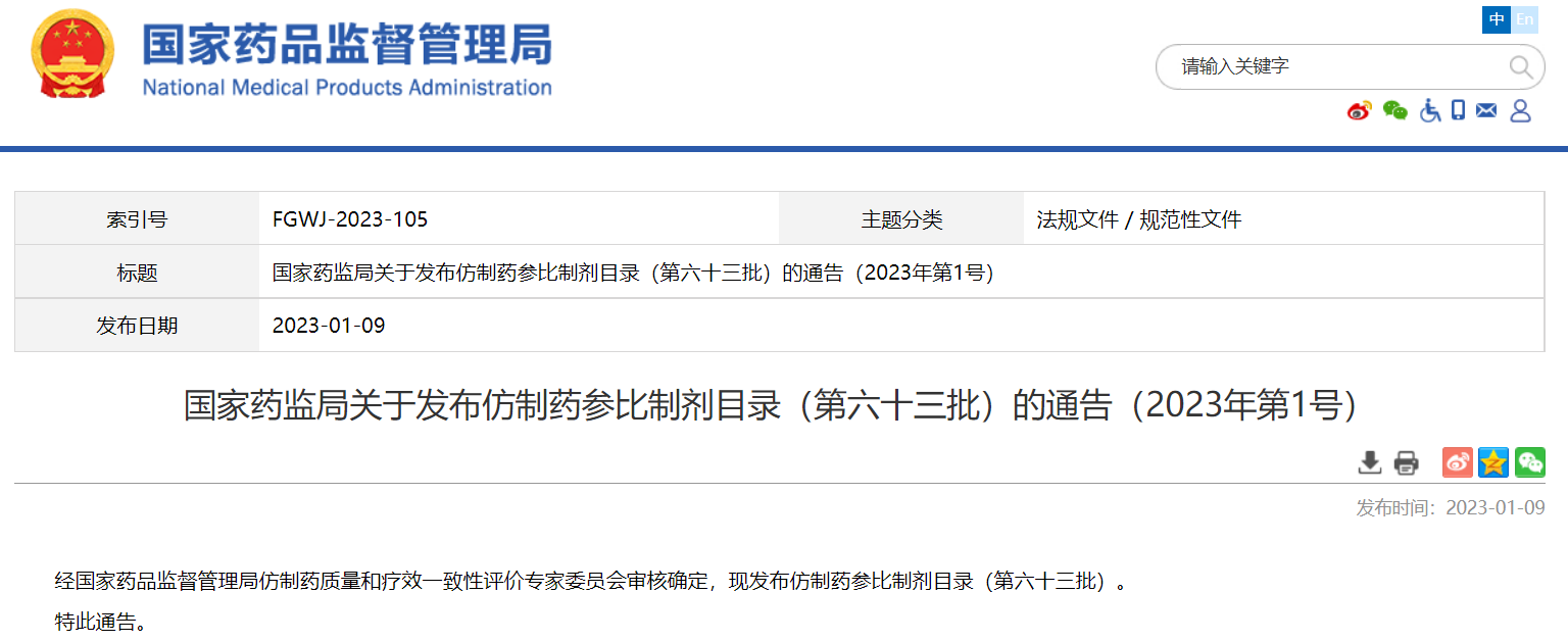 國家藥監局關于發布仿制藥參比制劑目錄(第六十三批)的通告(2023年第1號)