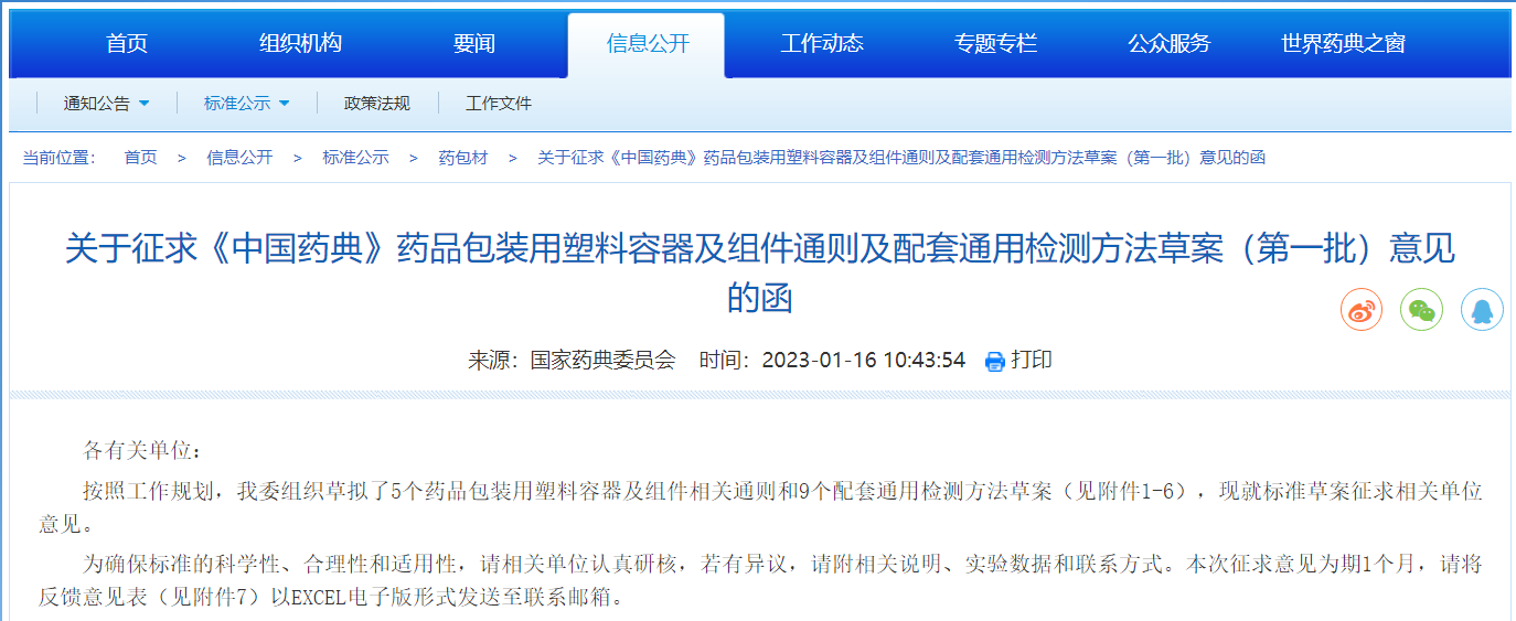 關于征求《中國藥典》藥品包裝用塑料容器及組件通則及配套通用檢測方法草案(第一批)意見的函