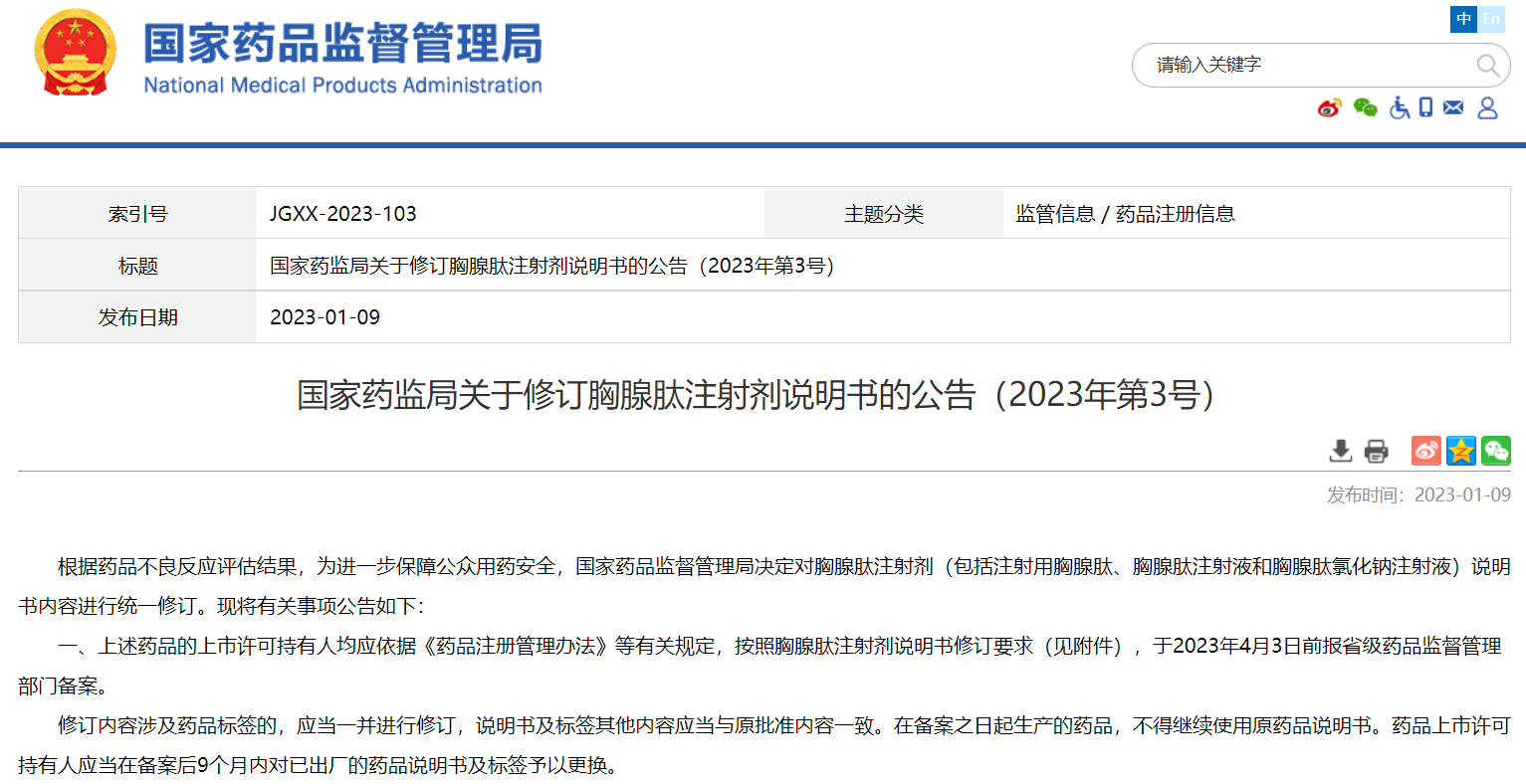 國家藥監局關于修訂胸腺肽注射劑說明書的公告(2023年第3號)