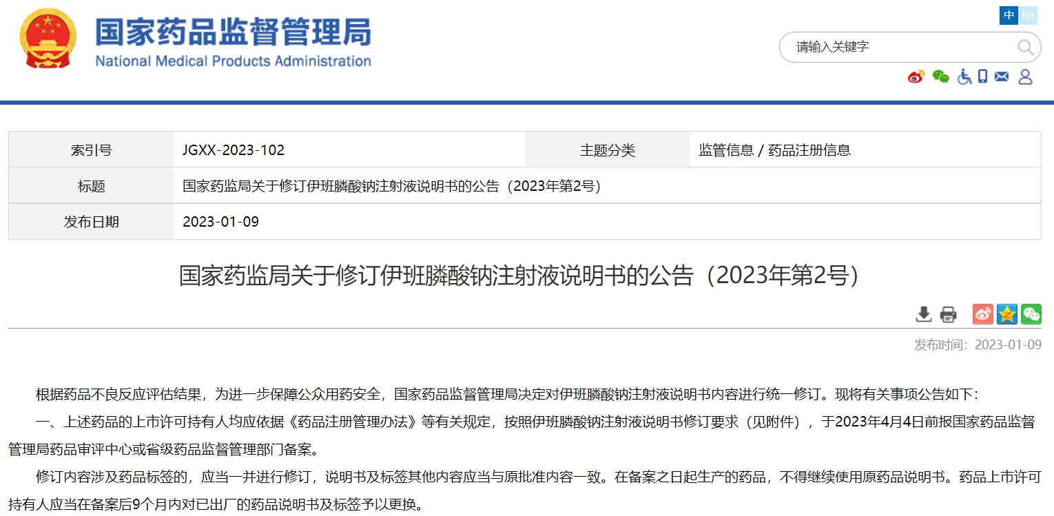 國家藥監局關于修訂伊班膦酸鈉注射液說明書的公告(2023年第2號)