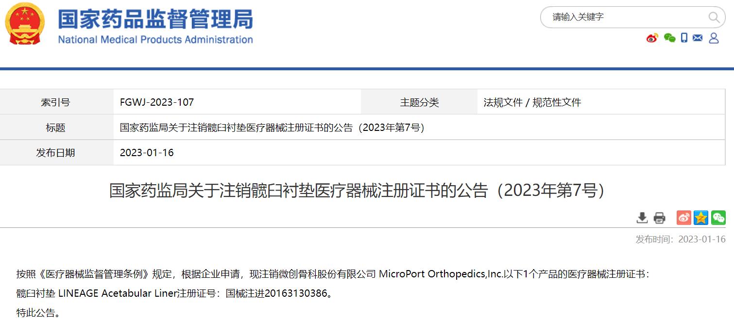 國家藥監局關于注銷髖臼襯墊醫療器械注冊證書的公告(2023年第7號)