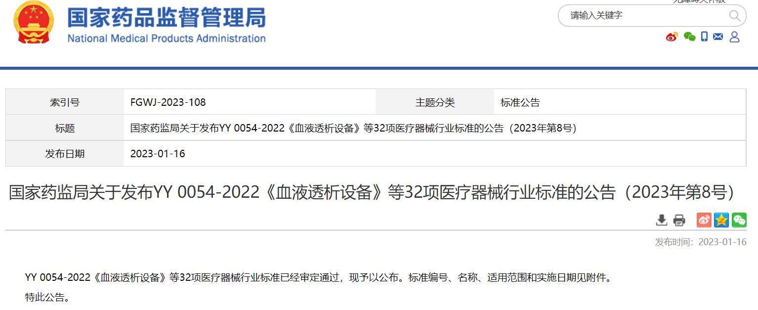 國家藥監局關于發布YY 0054-2022《血液透析設備》等32項醫療器械行業標準的公告(2023年第8號)