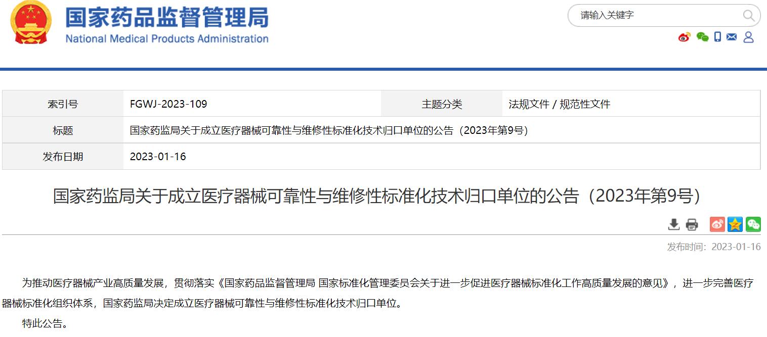 國家藥監局關于成立醫療器械可靠性與維修性標準化技術歸口單位的公告(2023年第9號)