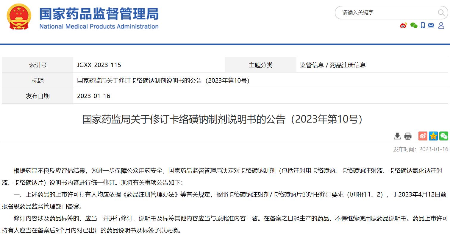 國家藥監局關于修訂卡絡磺鈉制劑說明書的公告(2023年第10號)