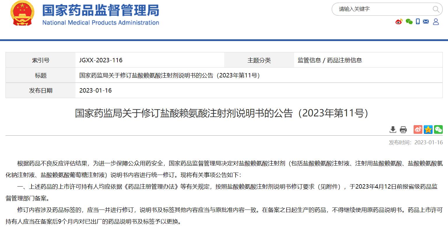 國家藥監局關于修訂鹽酸賴氨酸注射劑說明書的公告(2023年第11號)
