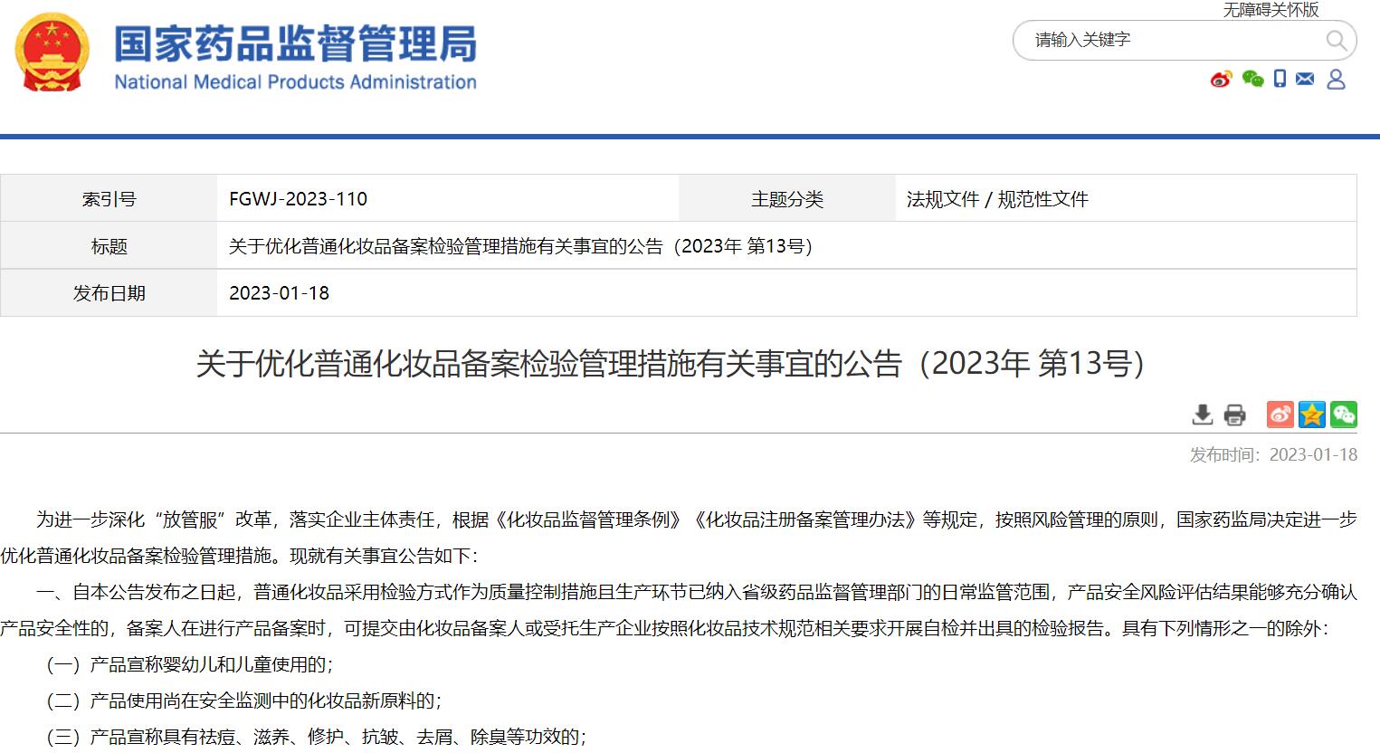 關于優化普通化妝品備案檢驗管理措施有關事宜的公告(2023年 第13號)