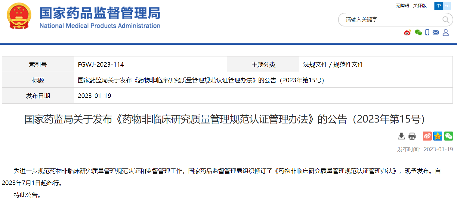 國家藥監(jiān)局關(guān)于發(fā)布《藥物非臨床研究質(zhì)量管理規(guī)范認證管理辦法》的公告(2023年第15號)