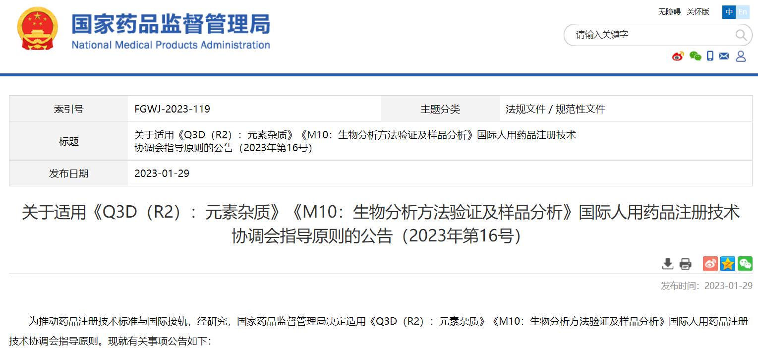 關(guān)于適用《Q3D(R2):元素雜質(zhì)》《M10:生物分析方法驗證及樣品分析》國際人用藥品注冊技術(shù)協(xié)調(diào)會指導(dǎo)原則的公告(2023年第16號)