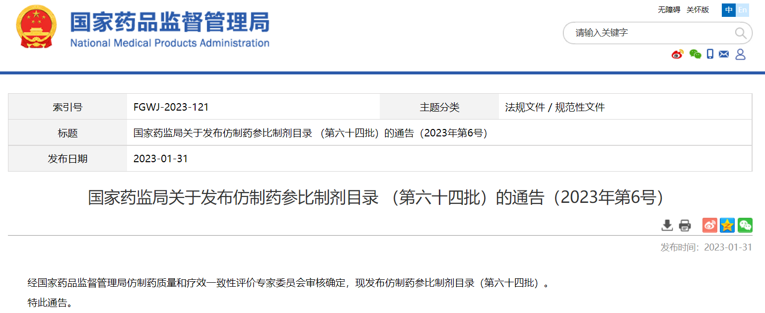 國家藥監(jiān)局關(guān)于發(fā)布仿制藥參比制劑目錄 (第六十四批)的通告(2023年第6號)