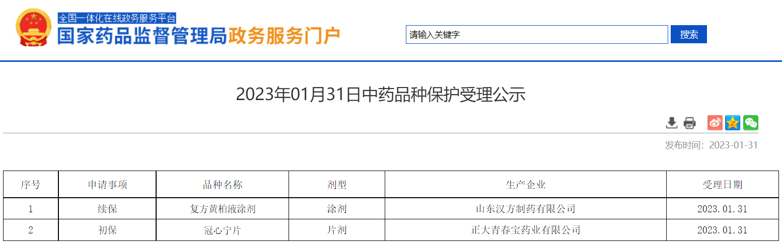 2023年01月31日中藥品種保護受理公示