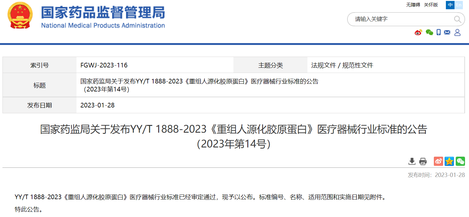 國家藥監(jiān)局關(guān)于發(fā)布YY/T 1888-2023《重組人源化膠原蛋白》醫(yī)療器械行業(yè)標準的公告 (2023年第14號)