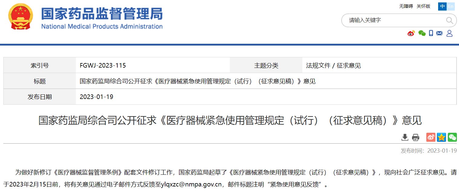 國家藥監(jiān)局綜合司公開征求《醫(yī)療器械緊急使用管理規(guī)定(試行)(征求意見稿)》意見