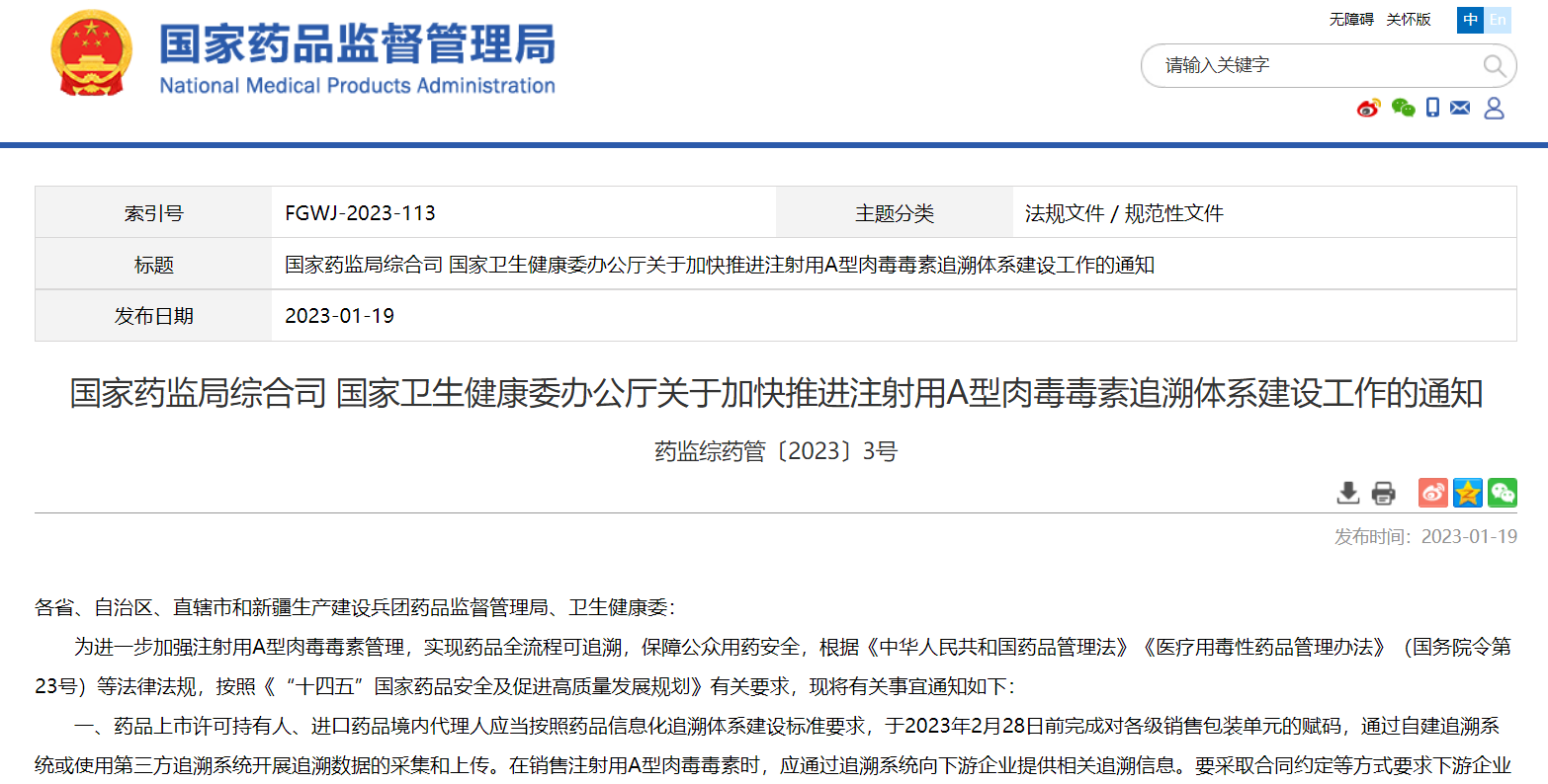 國家藥監(jiān)局綜合司 國家衛(wèi)生健康委辦公廳關(guān)于加快推進注射用A型肉毒毒素追溯體系建設(shè)工作的通知
